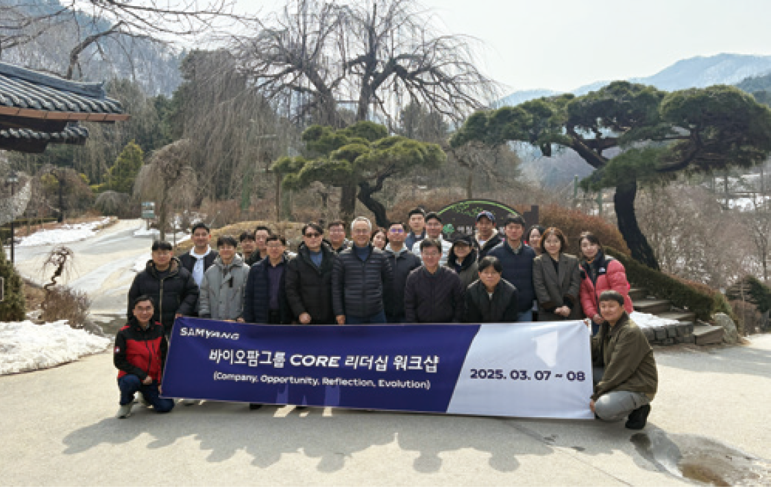 삼양홀딩스 바이오팜그룹은 3월 7~8일 2일간 가평 켄싱턴리조트에서 CORE 리더십 워크숍을 진행했다. CORE는 Company, Opportunity, Reflection, Evolution의 약어 로, 이번 워크숍이 바이오팜그룹(Company)의 핵심을 정의하고, 기회(Opportunity) 를 모색하며, 돌아보고(Reflection), 발전(Evolution)하는 과정임을 의미한다. 임원 및 팀장급 리더들은 워크숍을 통해 자유롭게 소통하며 바이오팜그룹의 성장 전략을 함 께 고민하는 뜻깊은 시간을 보냈다.